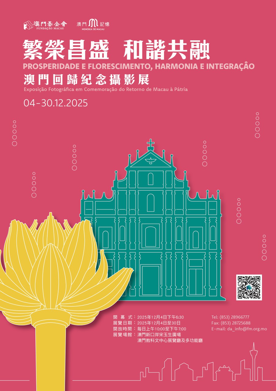 為慶祝澳門回歸祖國廿六周年,由澳門基金會主辦的“繁榮昌盛  和諧共融——澳門回歸紀念攝影展”將於2025年12月4日(星期四)18:30在澳門新口岸宋玉生廣場澳門教科文中心展覽廳及多功能廳正式開幕。