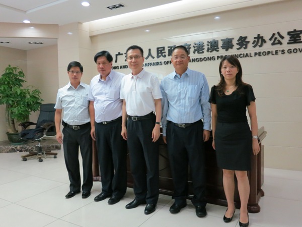 19日上午,本會主席吳志良與澳門特別行政區政府政策研究室主任劉本立、職務主管高展明等共同拜訪廣東省港澳辦,與主任廖京山、副主任金萍就目前區域合作的進程,以及為日後進一步加強區域合作的課題進行深入交流。