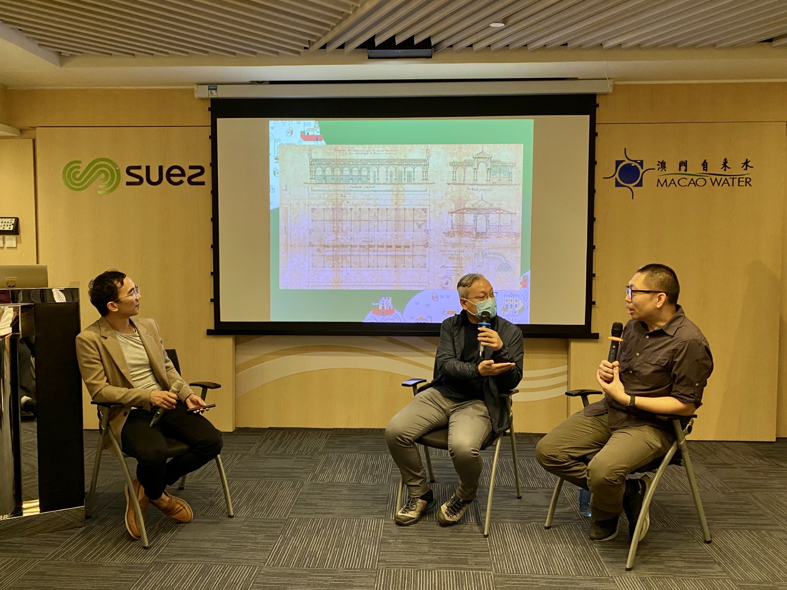 第二場講座以對談模式舉行,由文化遺產建築師呂澤強和城市規劃師林翊捷,共同分享“百年供水與澳門城市發展”,從歷史上澳門的用水情況、人口、本地生產總值(GDP)的數據出發,林翊捷指出了澳門用水與社會發展的關係和趨勢,結合呂澤強發現建築設計的轉變,從只有水井的位置,到對水管的法例要求,以至高層樓宇的儲水池設計,印證了不同時期澳門的建築設計與當時的用水情況和社會經濟發展緊密相關。同時,對談上延伸分享了工業用水、文娛康樂用水,以至環保考慮的中水回用等與城市發展相關的“水”議題。