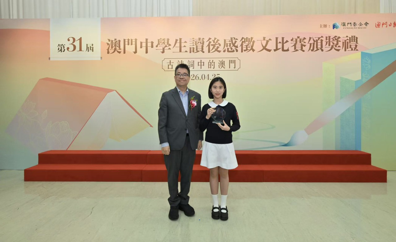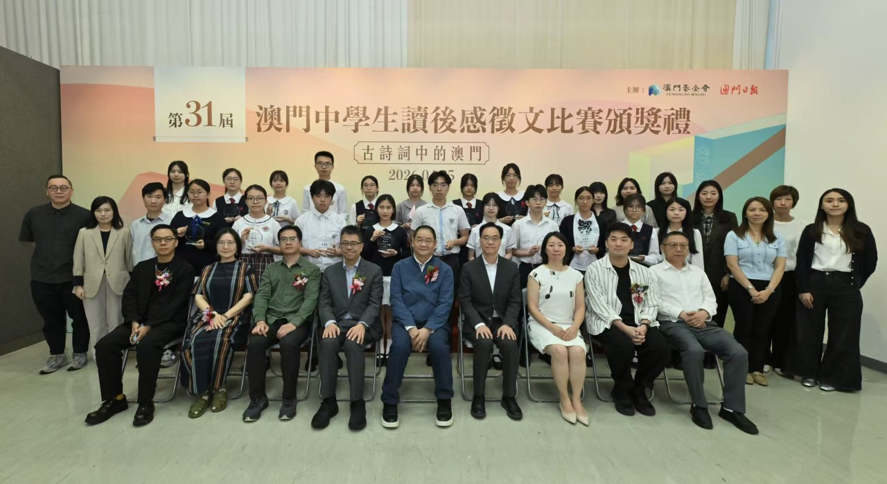 由澳門基金會與澳門日報合辦的第三十一屆“澳門中學生讀後感徵文比賽”反應熱烈,本屆以“古詩詞中的澳門”為主題,共收到27間學校439份參賽作品。頒獎禮已於2026年4月25日在澳門教科文中心舉行,主辦單位向二十位獲獎學生頒發獎座,以示鼓勵。澳門基金會行政委員會主席吳志良,澳門日報總編輯崔志濤,高中組評判谷雨、陸奧雷,初中組評判譚健鍬、林格,以及各校校長、老師、獲奬同學及其家長出席典禮,場面熱鬧。