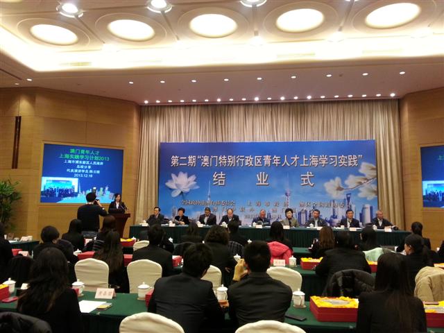A Cerimónia de Encerramento do “Projecto de Estágio dos Jovens de Macau em Xangai 2013” teve lugar no passado dia 18 de Dezembro, às 10H00, na sede do Comité da Conferência Consultiva Política do Povo Chinês do Município de Xangai,  e foi presidida pelas seguintes individualidades: o Vice-Presidente do Comité Nacional da Conferência Consultiva Política do Povo Chinês, Ho Hau Wah, o Vice-Presidente do Comité da Conferência Consultiva Política do Povo Chinês do Município de Xangai, Jiang Liang, o Subdirector do Comité para os ultramarinos de Hong Kong, Macau e Taiwan da Conferência Consultiva Política do Povo Chinês, Hua Jian, Vice-Chefe do Departamento de Colaboração do Gabinete de Ligação do Governo Central da RPC na RAEM, Xu Shuang, o Presidente, o Vice- Presidente e o membro do Conselho de Administração da Fundação Macau, Wu Zhiliang, Lam Kam Seng Peter e Lai Chan Keong, respectivamente. As entidades organizadoras disseram “vir a esperar que os estagiários possam fazer uma reflexão sobre as experiências obtidas em Xangai, de modo a contribuir para a construção da RAEM”.