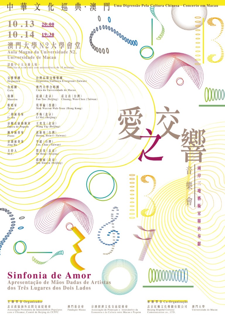 No intuito de divulgar a cultura tradicional chinesa, promover a cultura chinesa no mundo, fomentar os intercâmbios culturais entre os jovens de Macau e do Interior da China e incentivar o desenvolvimento das actividades culturais de Macau, vai-se realizar em Macau um Concerto intitulado “Sinfonia de Amor – Uma digressão pela Cultura Chinesa” que terá lugar no dia 14 de Outubro, pelas 19H30, na Aula Magna da Universidade N2 da Universidade de Macau. Este espectáculo conta com a organização conjunta da Associação Promotora de Intercâmbios Populares com o Ultramar do Comité de Bei Jing da CCPPC, Fundação Macau e Associação de Promoção e Intercâmbio da Economia e da Cultura entre Macau e Pequim e a produção está a cargo da Universidade de Macau e da “Bei Jing Hopeful Cultural Communication col., LTD.”