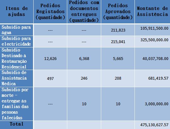 - Subsídio por morte- entregue aos familiares das pessoas falecidas: no início de Setembro de 2017 foi deferido o montante total de 3 milhões para 10 famílias dos sinistrados.