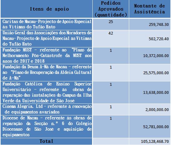 Após a passagem do tufão “Hato” no ano passado, a Fundação Macau lançou logo no dia 25 de Agosto o Projecto de Ajuda Especial aos Prejuízos Causados pela Passagem do Tufão “Hato” para dar os apoios financeiros necessários aos residentes afectados. Este projecto já está concluído e envolve cerca de 580 milhões, verba na qual se inclui o montante de 475 milhões a título de “diversos subsídios” e 105 milhões a título de “outros itens de apoio”.